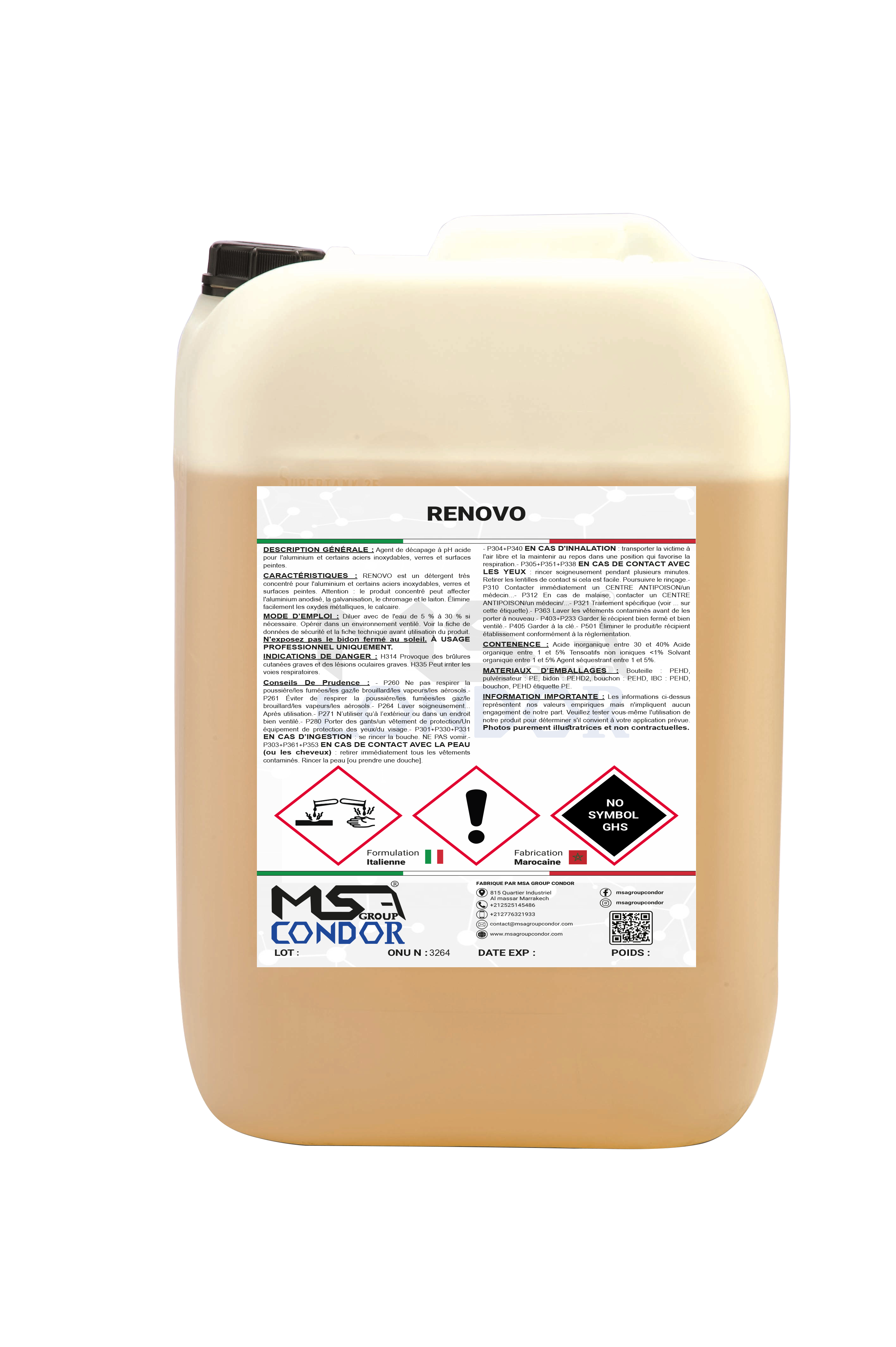 CARACTÉRISTIQUES : RENOVO est un détergent très concentré pour l’aluminium et certains aciers inoxydables, verres et surfaces peintes. Attention : le produit concentré peut affecter l’aluminium anodisé, la galvanisation, le chromage et le laiton. Élimine facilement les oxydes métalliques, le calcaire.