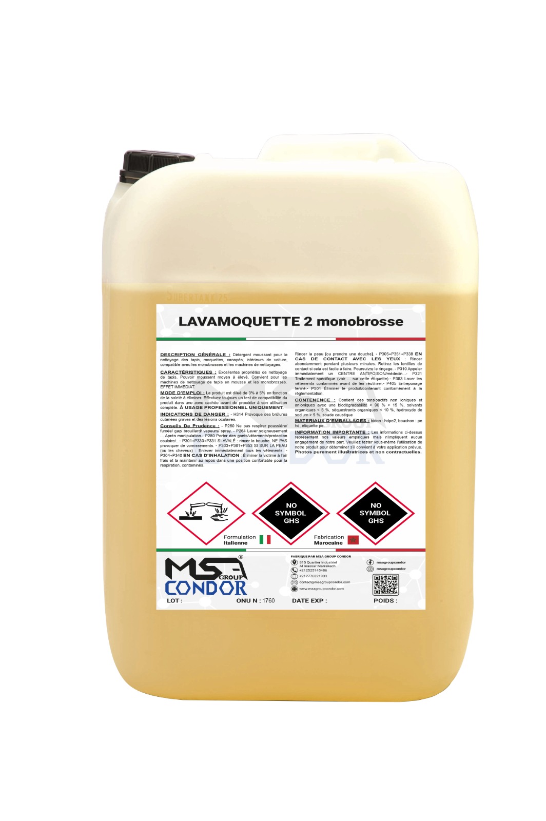 DESCRIPTION GÉNÉRALE : Détergent moussant pour le nettoyage des tapis, moquettes, canapés, intérieurs de voiture, compatible avec les monobrosses et les machines de nettoyages.