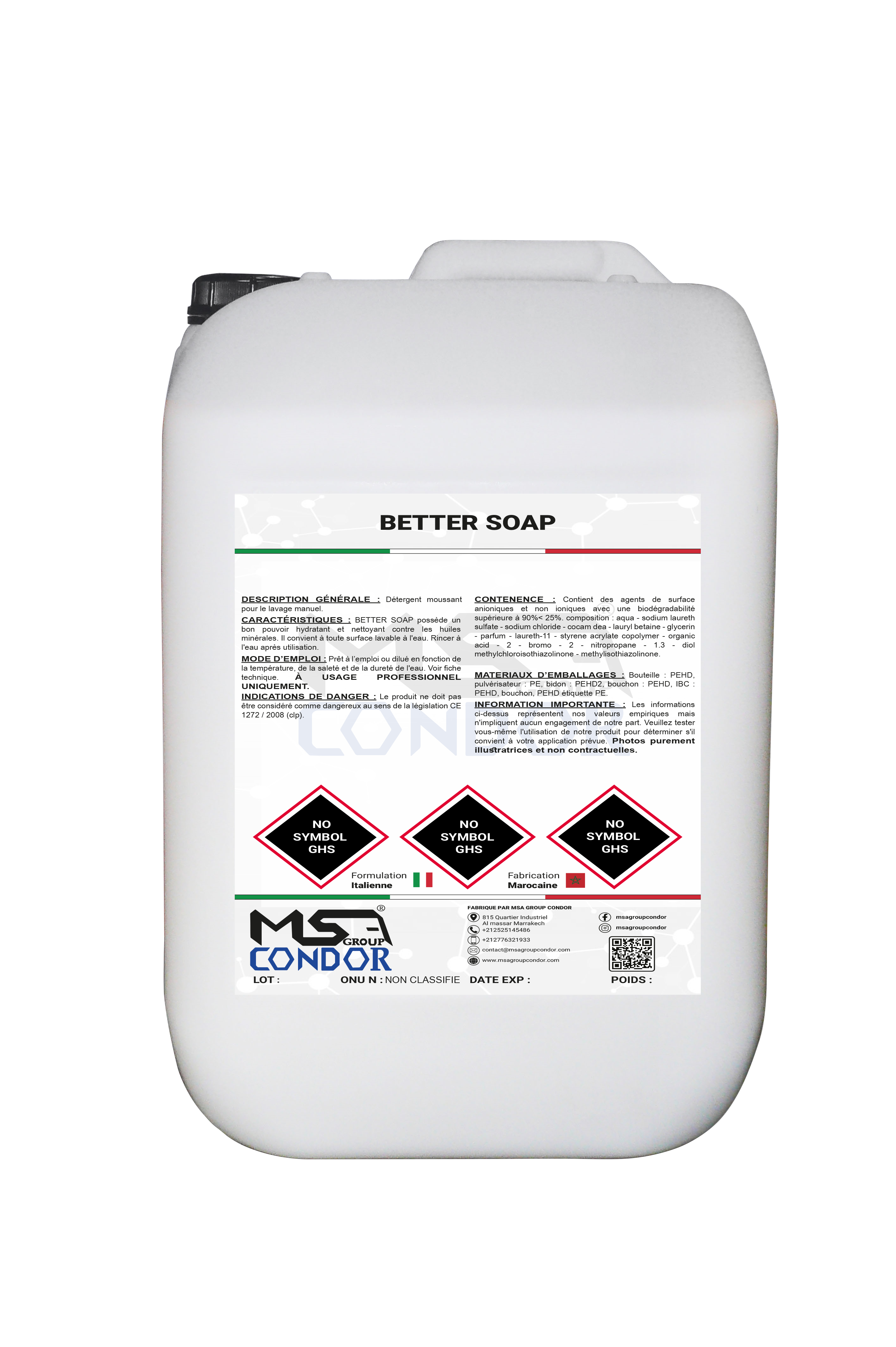 CARACTÉRISTIQUES : BETTER SOAP possède un bon pouvoir hydratant et nettoyant contre les huiles minérales. Il convient à toute surface lavable à l’eau. Rincer à l’eau après utilisation.