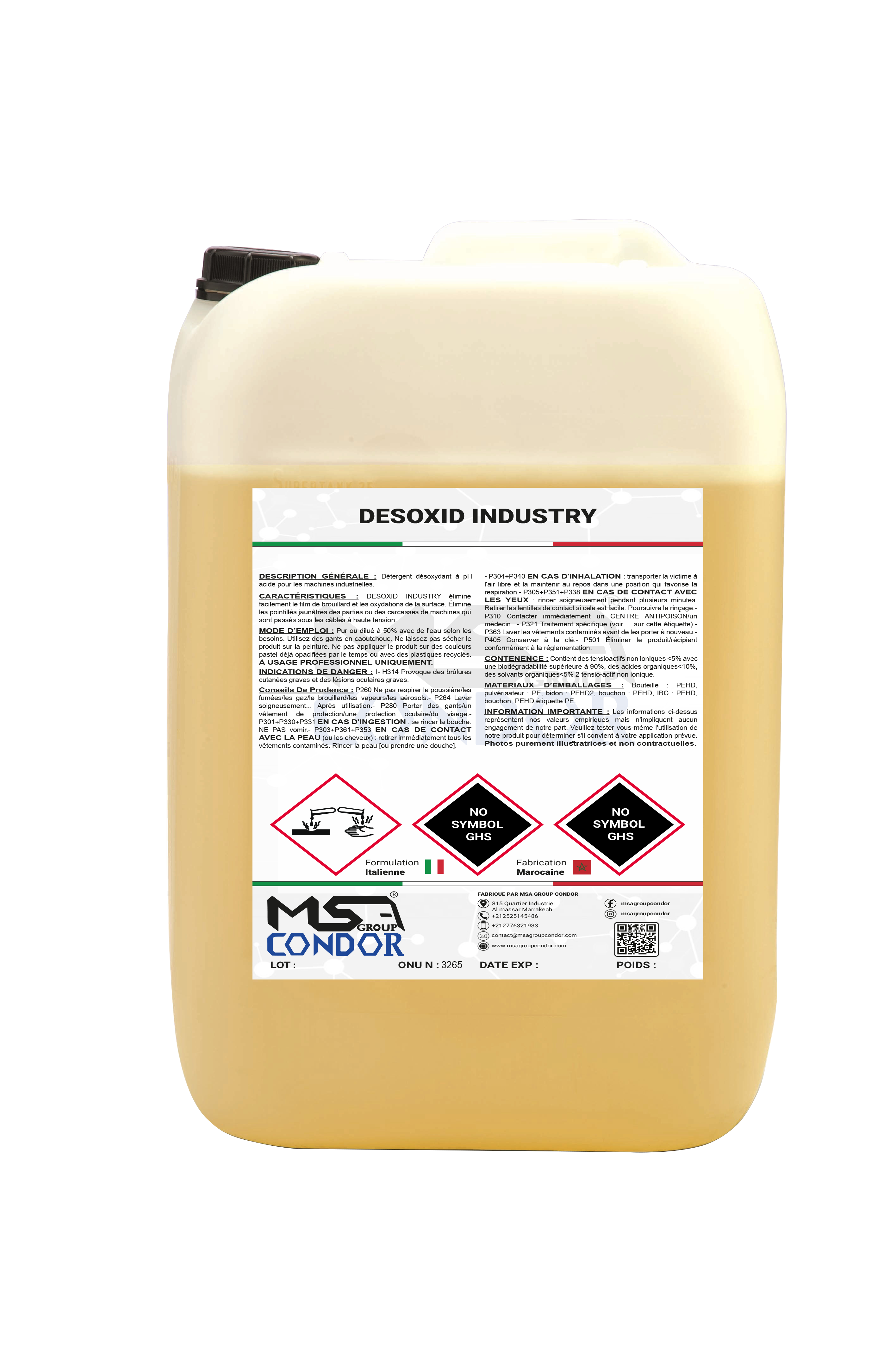 CARACTÉRISTIQUES : DESOXID INDUSTRY élimine facilement le film de brouillard et les oxydations de la surface. Élimine les pointillés jaunâtres des parties ou des carcasses de machines qui sont passés sous les câbles à haute tension.
