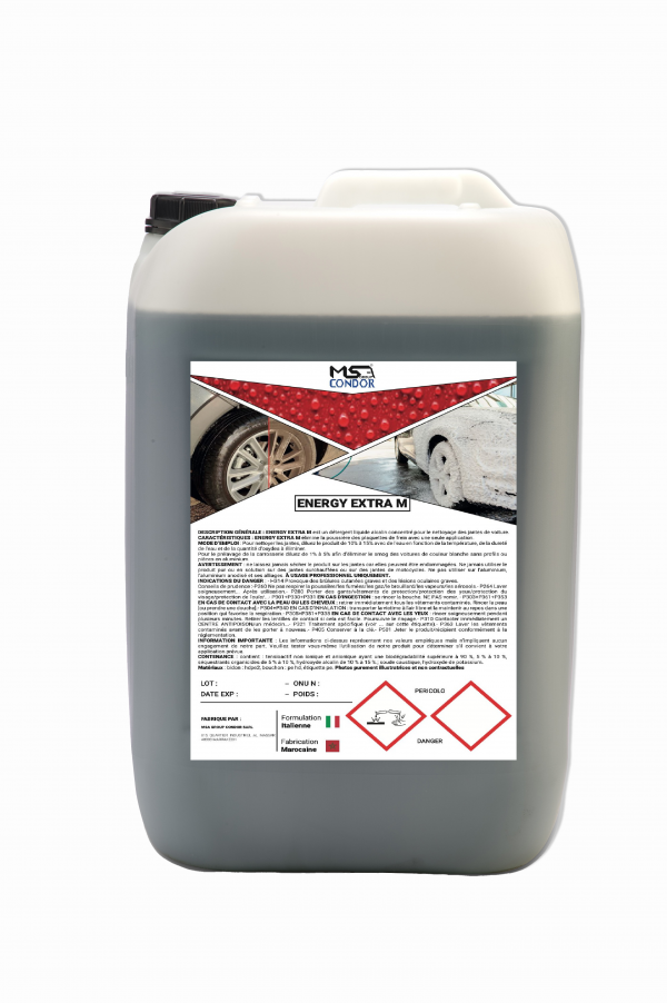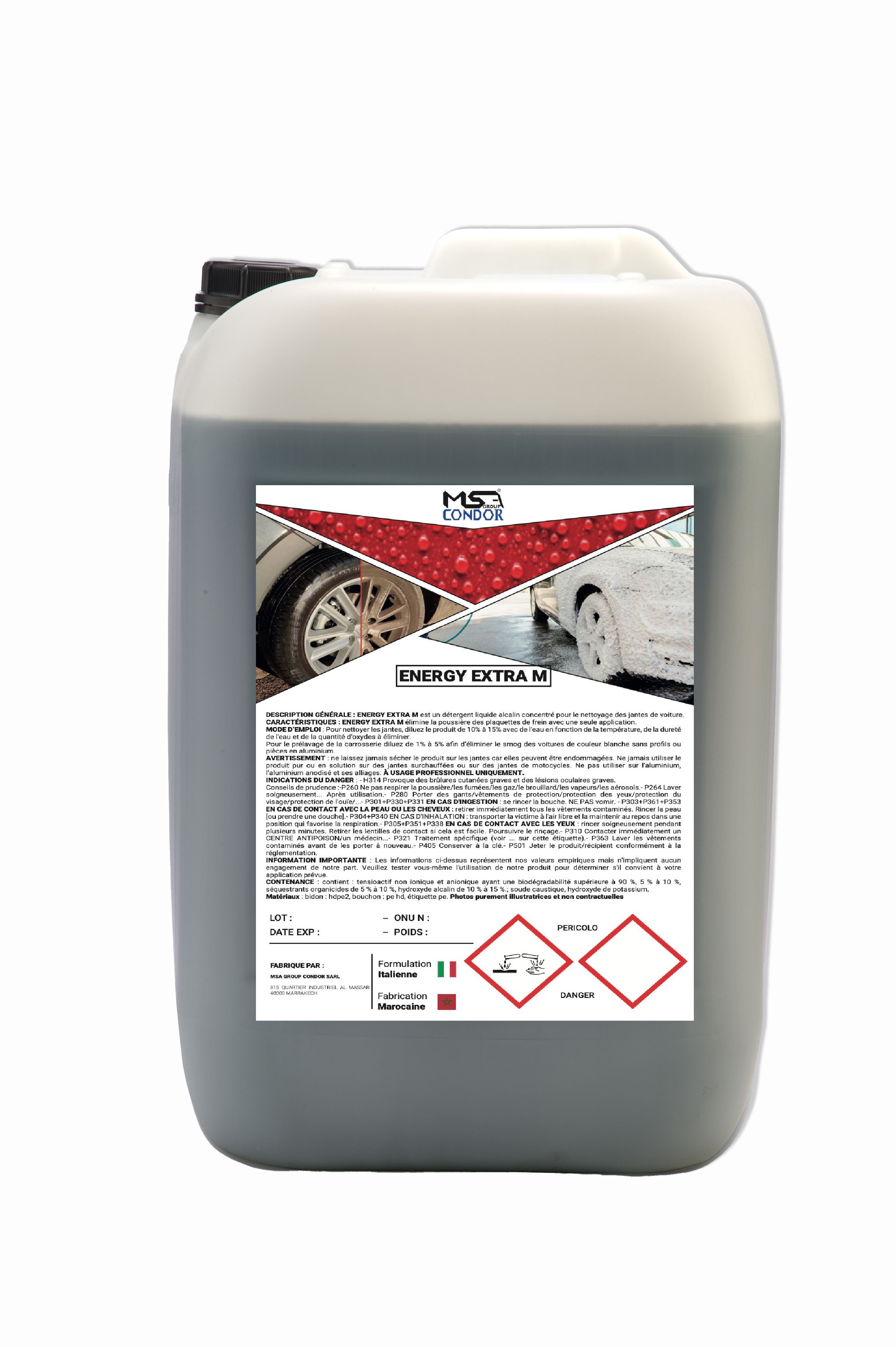 DESCRIPTION GÉNÉRALE : ENERGY EXTRA M est un détergent liquide alcalin concentré pour le nettoyage des jantes, moteurs et carrosserie des voitures.
