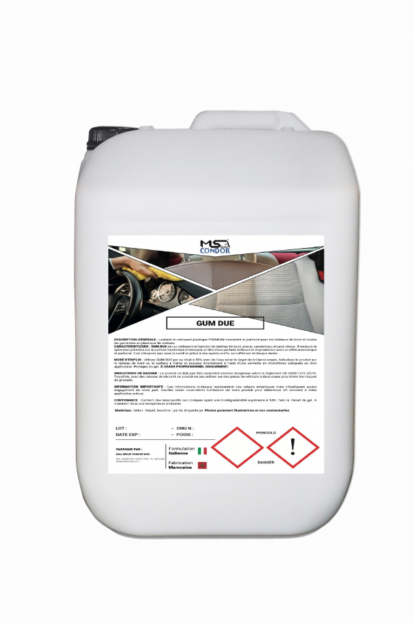 MODE D’EMPLOI : Utilisez GUM DUE pur ou dilué à 50% avec de l’eau selon le degré de brillance requis. Nébulisez le produit sur le tableau de bord ou la surface à traiter et essuyez directement à l’aide d’une serviette en microfibres adéquate ou d’un applicateur. Protégez du gel. À USAGE PROFESSIONNEL UNIQUEMENT.