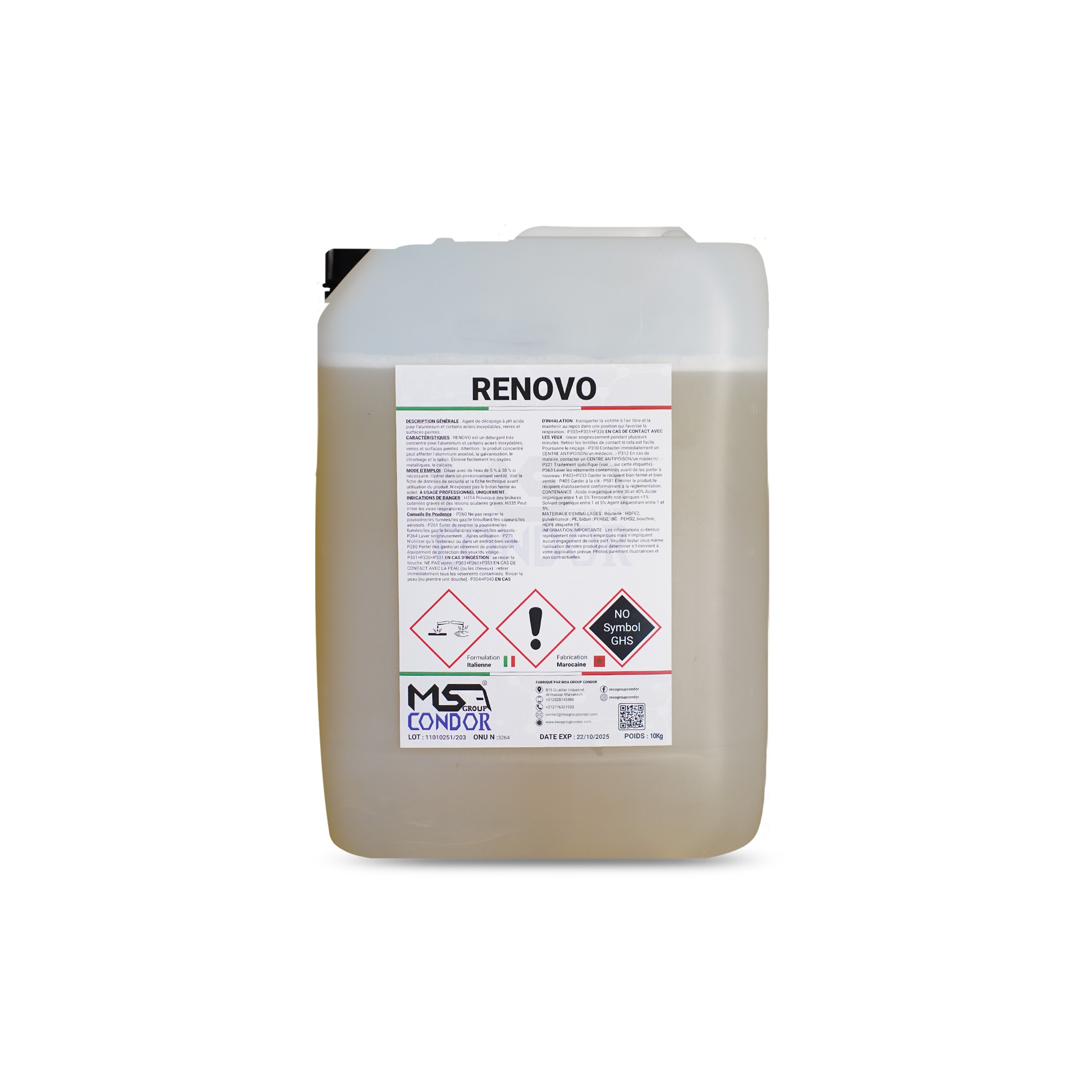 CARACTÉRISTIQUES : RENOVO est un détergent très concentré pour l’aluminium et certains aciers inoxydables, verres et surfaces peintes. Attention : le produit concentré peut affecter l’aluminium anodisé, la galvanisation, le chromage et le laiton. Élimine facilement les oxydes métalliques, le calcaire.