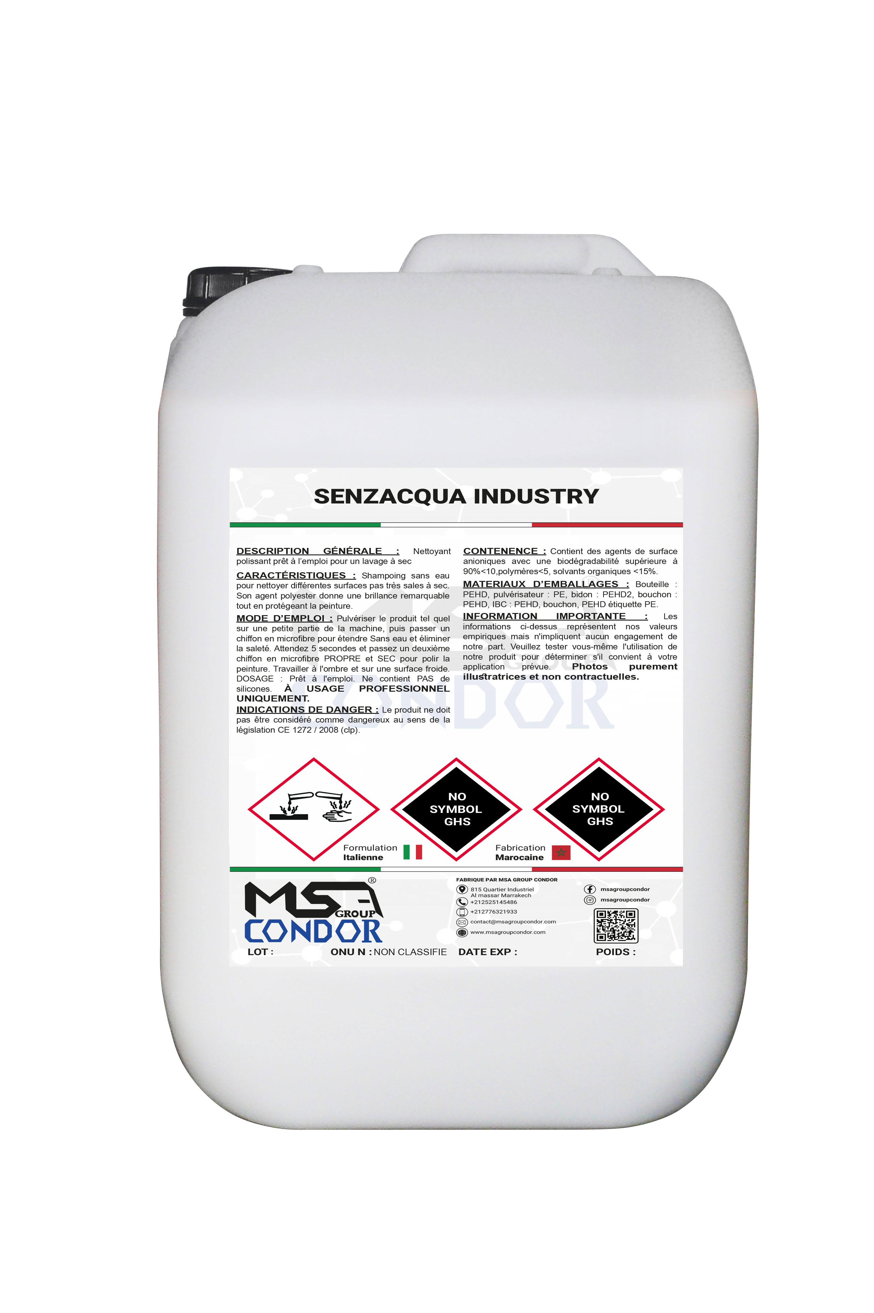 MODE D’EMPLOI : Pulvériser le produit tel quel sur une petite partie de la machine, puis passer un chiffon en microfibre pour étendre Sans eau et éliminer la saleté. Attendez 5 secondes et passez un deuxième chiffon en microfibre PROPRE et SEC pour polir la peinture. Travailler à l’ombre et sur une surface froide. DOSAGE : Prêt à l’emploi. Ne contient PAS de silicones. AGITER AVANT UTILISATION. À USAGE PROFESSIONNEL UNIQUEMENT.