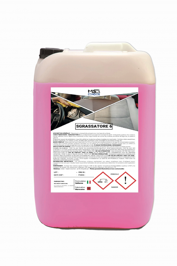 CARACTERISTIQUES : SGRASSATORE 6 est un dégraissant qui supprime tout type de saleté : huile grasse, graisse, cire, couleurs, encres, adhésifs, savon, dépôts doux carbonisé, la suie, rouge à lèvres, les taches de protéines, les tâches de légumes, la saleté en général.