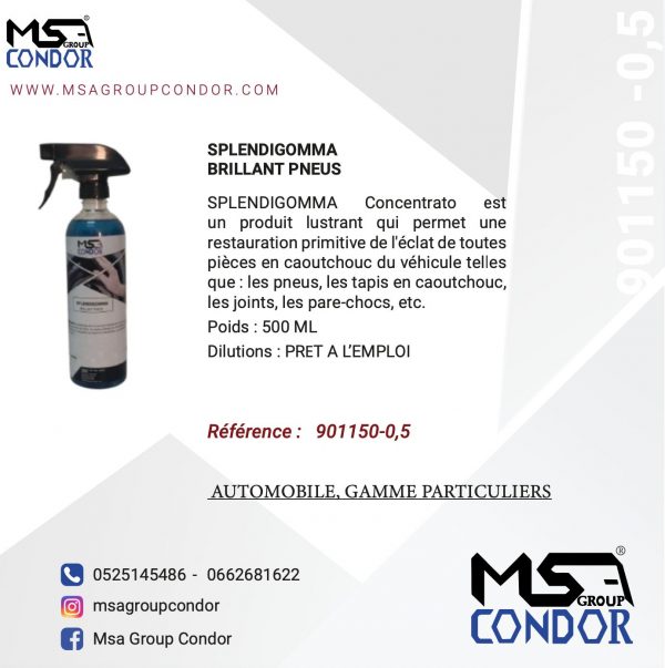 SPLENDIGOMMA Concentrato est un produit lustrant qui permet une restauration primitive de l’éclat de toutes pièces en caoutchouc du véhicule telles que : les pneus, les tapis en caoutchouc, les joints, les pare-chocs, etc.