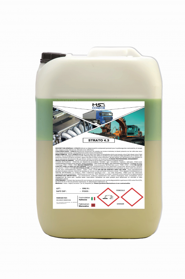 DESCRIPTION GÉNÉRALE : STRATO 4.3 est un dégraissant bi-composant puissant pour le prélavage des carrosseries, le lavage des moteurs et des bâches de véhicules avec nébuliseur.