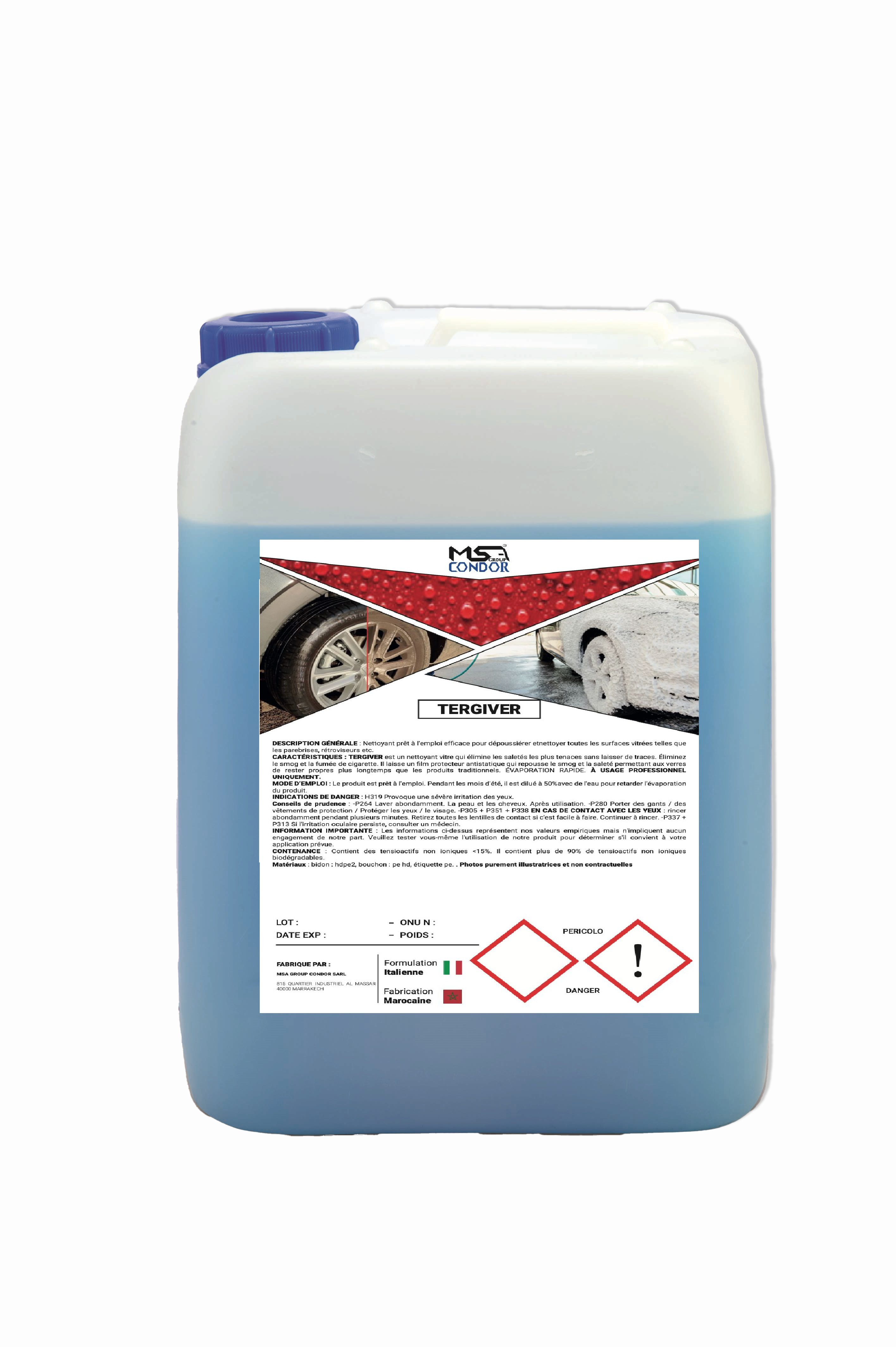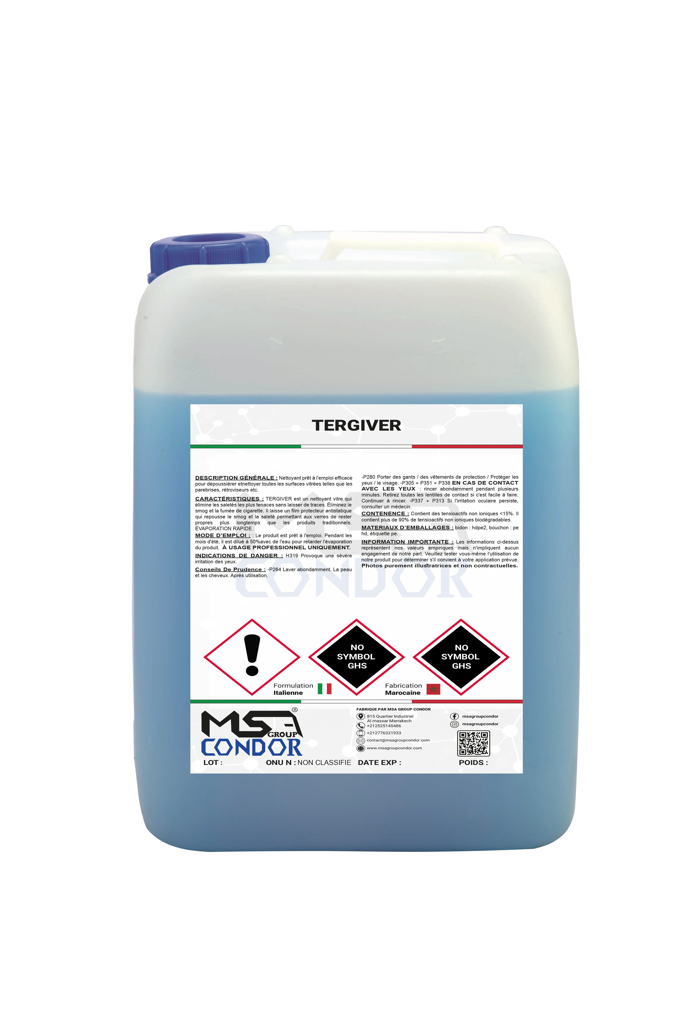 CARACTÉRISTIQUES : TERGIVER est un nettoyant vitre qui élimine les saletés les plus tenaces sans laisser de traces. Éliminez le smog et la fumée de cigarette. Il laisse un film protecteur antistatique qui repousse le smog et la saleté permettant aux verres de rester propres plus longtemps que les produits traditionnels. ÉVAPORATION RAPIDE. À USAGE PROFESSIONNEL UNIQUEMENT.