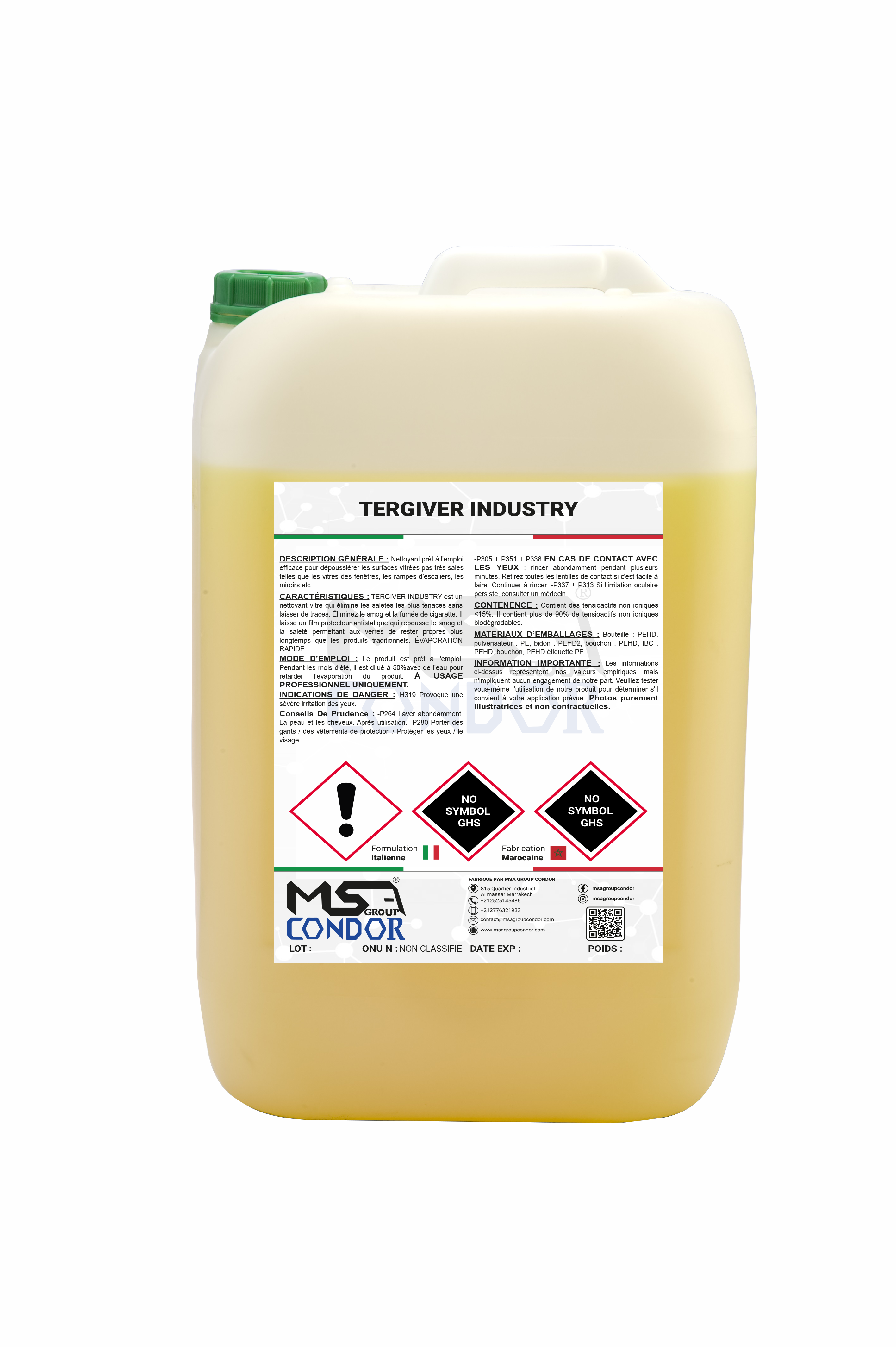 CARACTÉRISTIQUES : TERGIVER INDUSTRY est un nettoyant vitre qui élimine les saletés les plus tenaces sans laisser de traces. Éliminez le smog et la fumée de cigarette. Il laisse un film protecteur antistatique qui repousse le smog et la saleté permettant aux verres de rester propres plus longtemps que les produits traditionnels. ÉVAPORATION RAPIDE. À USAGE PROFESSIONNEL UNIQUEMENT.