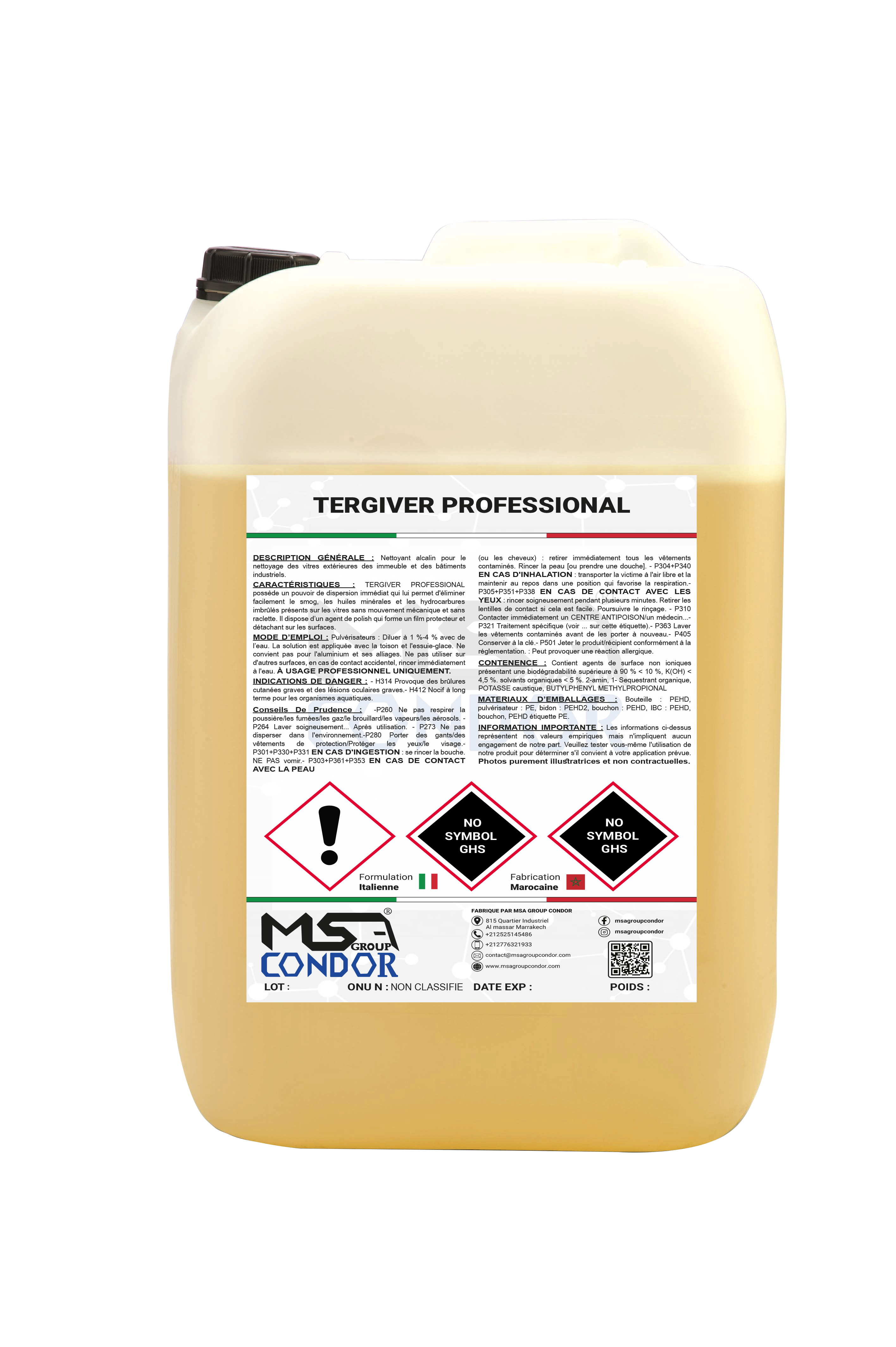 CARACTÉRISTIQUES : TERGIVER PROFESSIONAL possède un pouvoir de dispersion immédiat qui lui permet d’éliminer facilement le smog, les huiles minérales et les hydrocarbures imbrûlés présents sur les vitres sans mouvement mécanique et sans raclette. Il dispose d’un agent de polish qui forme un film protecteur et détachant sur les surfaces.