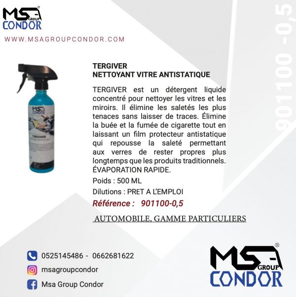 MODE D’UTILISATION : Le produit est prêt à l’emploi. Vaporisez sur la vitre puis essuyez à l’aide d’une microfibre spéciale vitre de MSA AUTO.